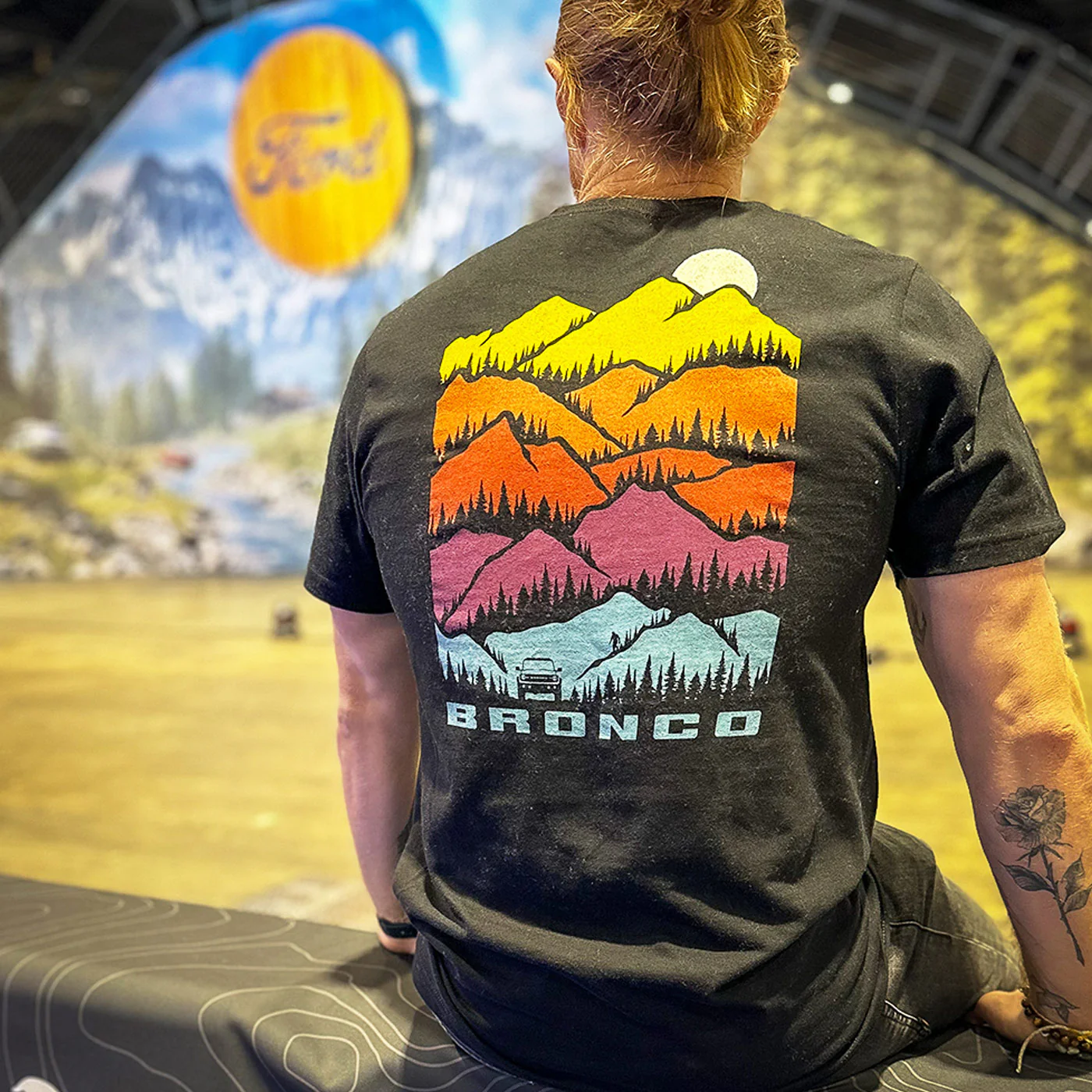 The tee is a black body and made from 100% cotton. On the upper left chest pocket is a Bronco logo in yellow. When turning around you can show off the backside graphic. The mountains are in vibrant colors of yellow, orange, red, purple, and teal. On the bottom you can see the Bronco going on an adventure and taking you along for the ride.