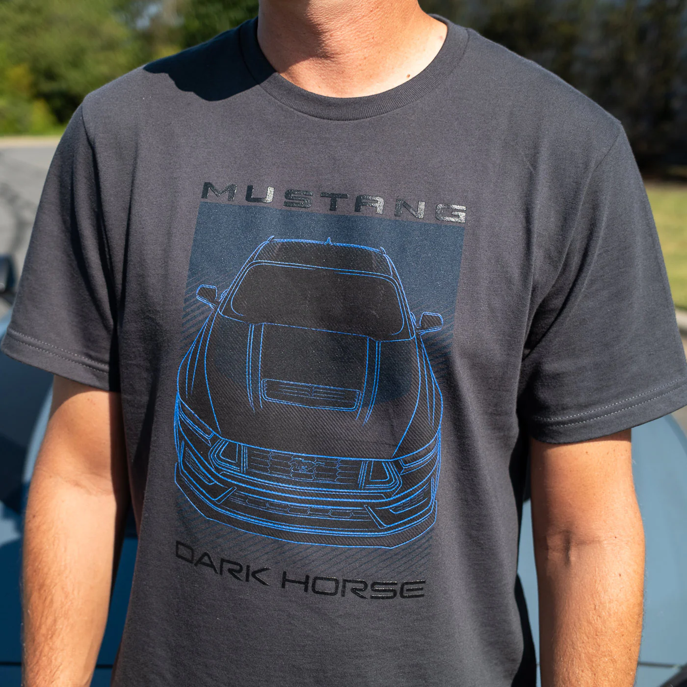 This men's Mustang Dark Horse t-shirt is a dark charcoal gray color. Its deep tone ensures the blue outlined Mustang Dark Horse graphic pops on the front. This shirt is made from 100 percent combed ring-spun cotton. It has a tagless neckline for comfort, with a classic crewneck cut for all-day wear. Show off your love of high-performance vehicles with this Mustang Dark Horse T-Shirt.