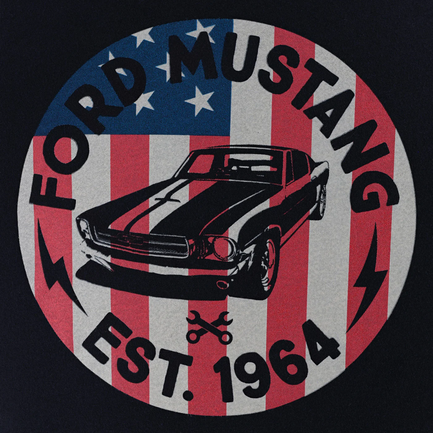 This vintage Mustang t-shirt comes in a bold black color. Its front features a galloping Mustang graphic. The back displays a patriotic flag background, overlayed with a silhouette of a classic 1964 Mustang in black. The t-shirt is designed with a relaxed fit and a tagless label to ensure comfort. This tee is made from 100% ring-spun cotton.
