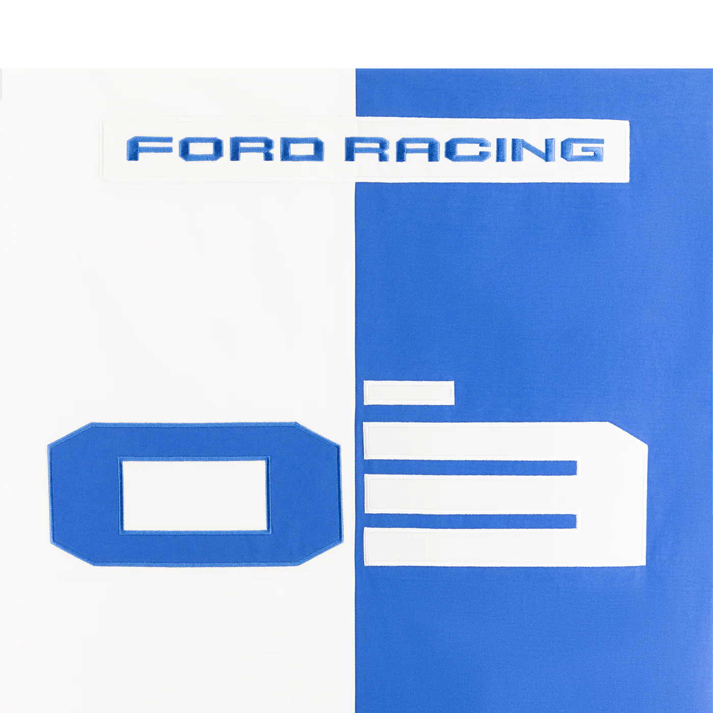 Step into the garage with attitude with this Ford Racing x Enchanté mechanic shirt. This button-down shirt channels authentic mechanic heritage through a striking blue-and-white that refuses to blend in. Crafted from 100 percent heavy cotton twill, it features bold embroidered accents and an appliqué "03" badge. Dual front pockets deliver function, while the crisp white collar and structured two-tone construction transform workwear into statement pieces. Built and designed to turn heads.